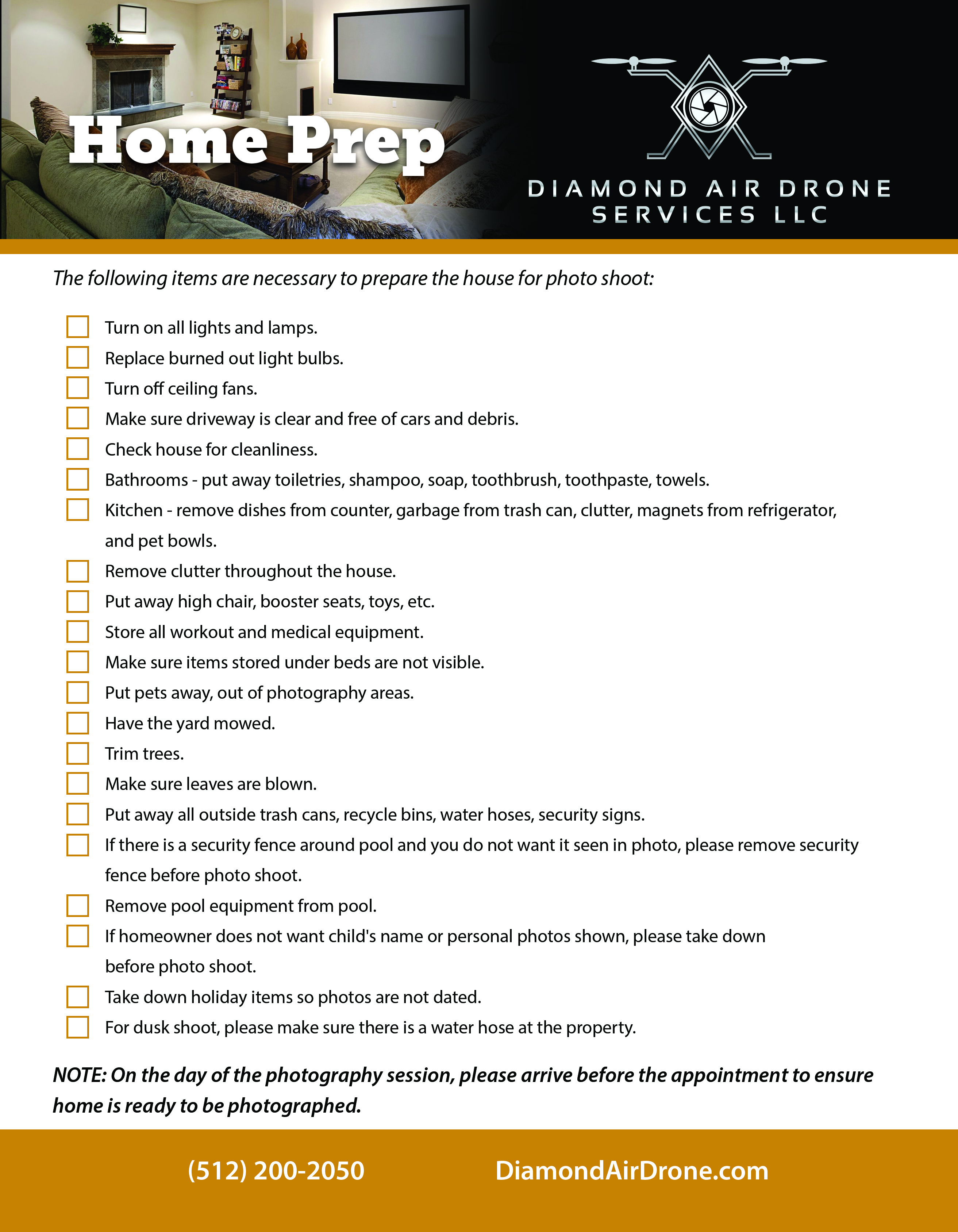 After setting an appointment with Diamond Air Drone Services LLC, please review the home preparation flyer to ensure your property is ready for the photo shoot. Here you will see all those requirements for photography